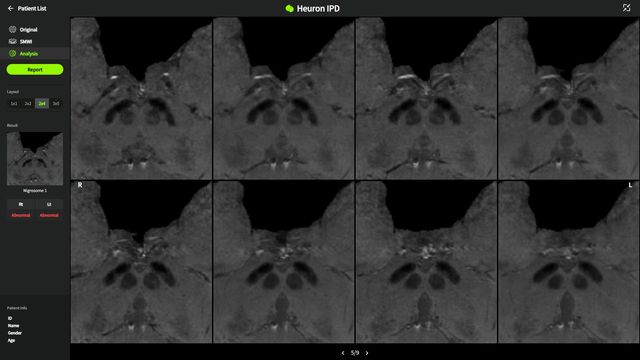 휴런IPD는 MRI를 기반으로 파킨슨병을 진단 보조하는 AI 솔루션이다. 기존 핵의학 검사가 필요했던 진단 방식을 보완해 경제성과 접근성이 좋고 방사선 노출 부담이 적은 3.0T MRI만으로 나이그로좀 영역의 이상 여부를 판단하고 분석 결과를 제공하는 솔루션이다. 파킨슨병이 진행되면 도파민 신경세포가 손상을 입는데, 이때 나이그로좀 영역에 소실이 발생하기 때문에 나이그로좀 영역의 변화는 파킨슨병 진단을 위한 주요 바이오마커로 활용된다.
