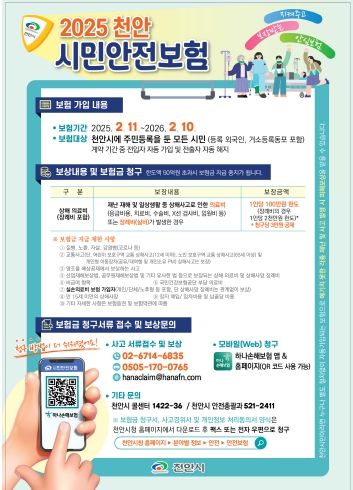 시는 천안시에 주민등록을 둔 시민이 일상생활에서 재해·재난, 사고 등으로 예상치 못한 피해를 본 시민의 생활 안정을 위해 시민안전보험에 가입하고 있다.