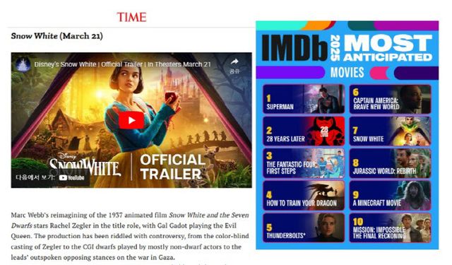 뿐만 아니라, 글로벌 평점 사이트 IMDB에서 2025년 가장 기대되는 영화 톱 10에 선정한 것은 물론, 세계적인 비평 사이트 로튼토마토에서도 올해 가장 기대되는 영화로 이름을 올렸다. 3월 개봉을 손꼽아 기다리는 팬들도 ‘백설공주’를 올해의 기대작으로 뽑았다. 북미 최대 영화 예매 사이트 판당고에서 올해 가장 기대되는 패밀리 무비로 ‘백설공주’를 선정해, 세대를 불문한 뜨거운 기대와 관심을 입증했다. 이렇듯 ‘백설공주’는 전 세계 언론과 팬들이 모두 손꼽아 기다리는 디즈니 판타지 뮤지컬 화제작의 명성을 자랑하고 있다.