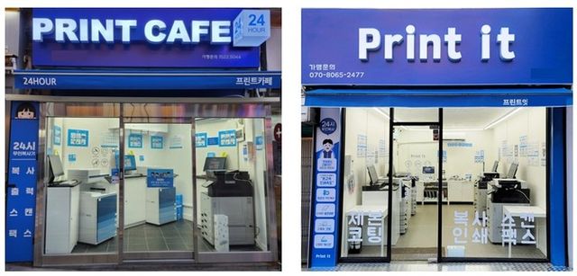 (왼쪽부터) 유피소프트가 운영하는 프린트카페와 셀링랩이 운영하는 프린트잇의 매장 전경. ⓒ 유피소프트