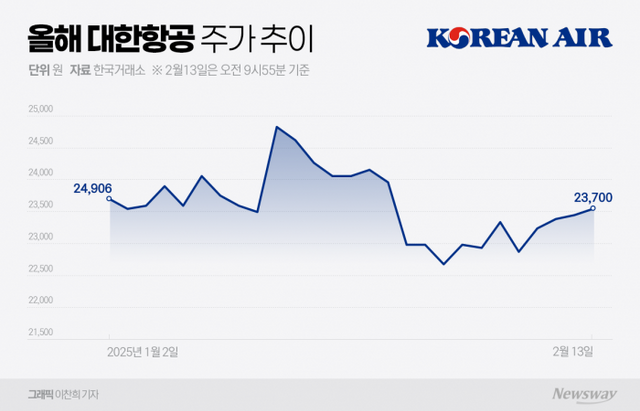 13일 오전 9시 55분 기준 대한항공은 전 거래일 대비 0.64% 오른 2만3700원에 거래되고 있다. 대한항공 주가는 올해 들어 0.6% 올랐고, 1년 전과 비교하면 3.7% 상승하는 데 그쳐 2만원대 초반 박스권에 머물러 있다.