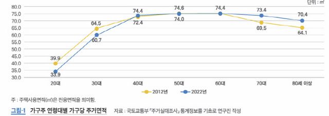 반면 20~30대는 가구당 주거면적이 오히려 줄어들었다. 20대와 30대는 10년간 주거면적이 각각 39.9㎡, 64.5㎡에서 33.9㎡, 60.7㎡로 줄어들었다. 40대, 50대, 60대는 10년전 72.4㎡, 74.0㎡, 74.4㎡에서 2022년 74.4㎡, 74.6㎡, 74.4㎡로 거의 변화가 없었다.