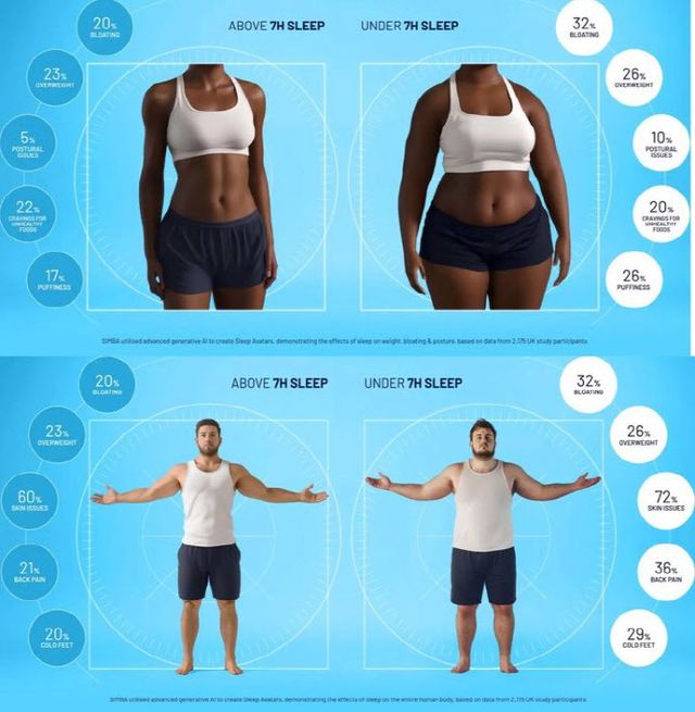 AI 영상을 보면 수면이 부족한 남성과 여성은 근육이 빠지고 복부에 살이 찌면서 가슴, 엉덩이, 허벅지 등이 부어올랐다. 얼굴엔 여드름과 잡티 등이 생겼으며, 피부색이 칙칙하고 눈 밑에 심한 다크서클이 생겼다. 또 주름도 깊어지고 생기가 없는 모습을 보였다.