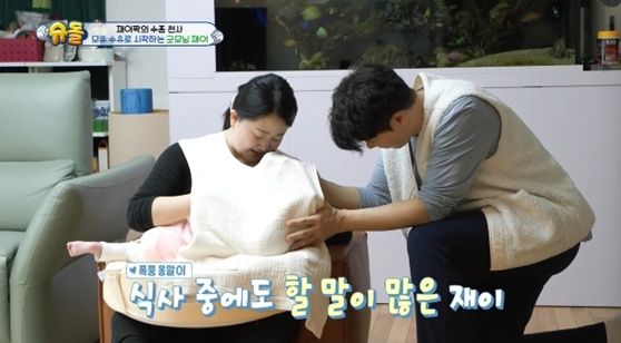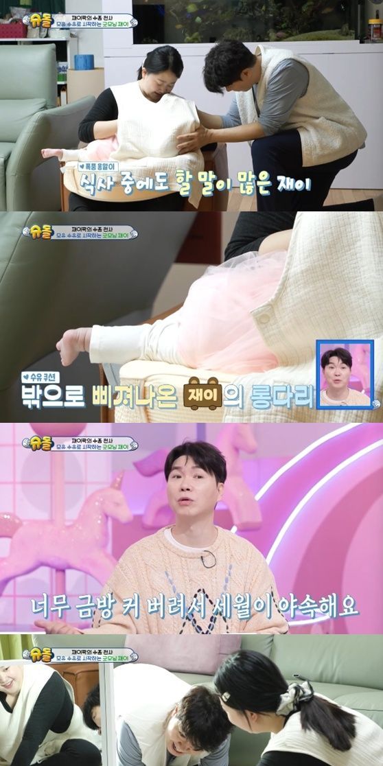 이날 박수홍은 재이에게 모유 수유를 하는 김다예를 도와줬다. 김다예와 박수홍은 수유쿠션 밖으로 삐져나온 재이의 다리를 보며 감탄했다. 박수홍은 "순간순간이 아깝다"라며 재이의 성장을 아쉬워했다.
