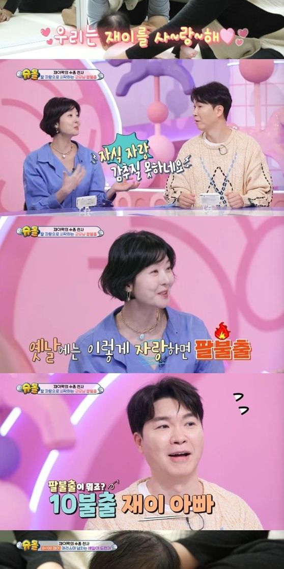 송선미는 "본인 아이가 좋아도 덜 드러내는데 감추지를 못 한다. 옛날에는 이렇게 하면 팔불출이라고 하지 않냐"라며 놀렸다. 최지우와 안영미도 "우리가 차마 팔불출이란 단어는 못 썼다", "십불출이다"라며 웃었다.