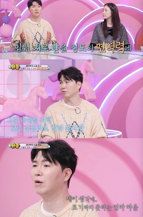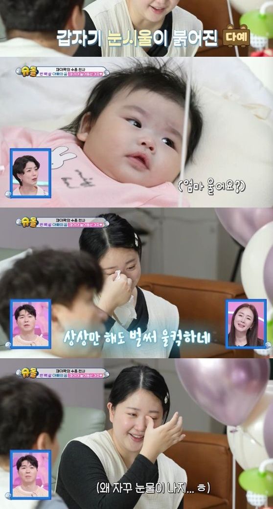 박수홍은 스튜디오에서 "다예 씨가 염증 수치가 일반인보다 20배가 높다. 그래서 그것 때문에 입원해서 치료도 받았었고 큰 수술도 받았다. 다예 씨를 위해 어느 정도 컸으니 단유하라고 했는데 재이를 위해 최선을 다해 나올 때까지 하겠다고 하더라. 지금도 면역 치료를 받고 있다"라며 안쓰러워했다.