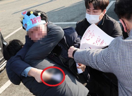 지난해 1월 2일 오전 부산 강서구 대항전망대에서 더불어민주당 이재명 대표를 흉기로 피습한 김모씨가 경찰에 제압되고 있다.