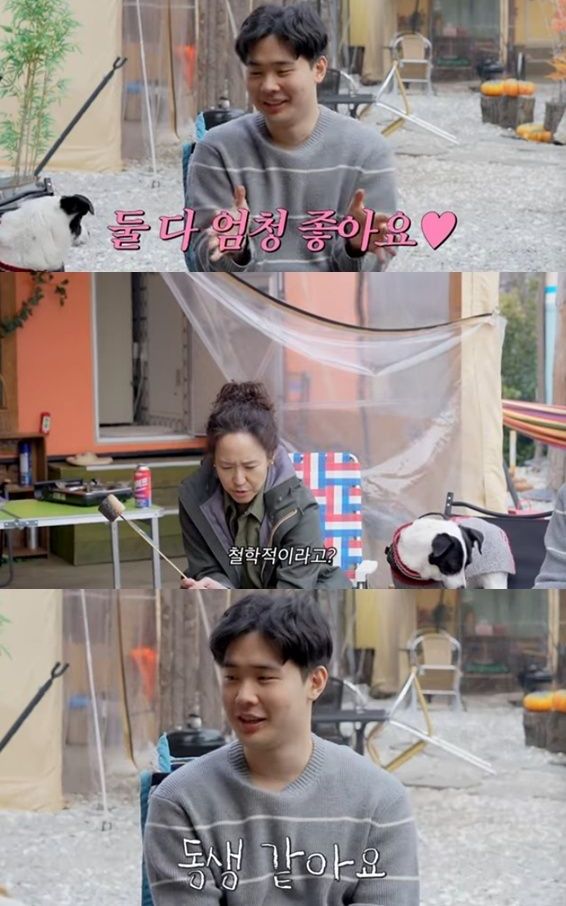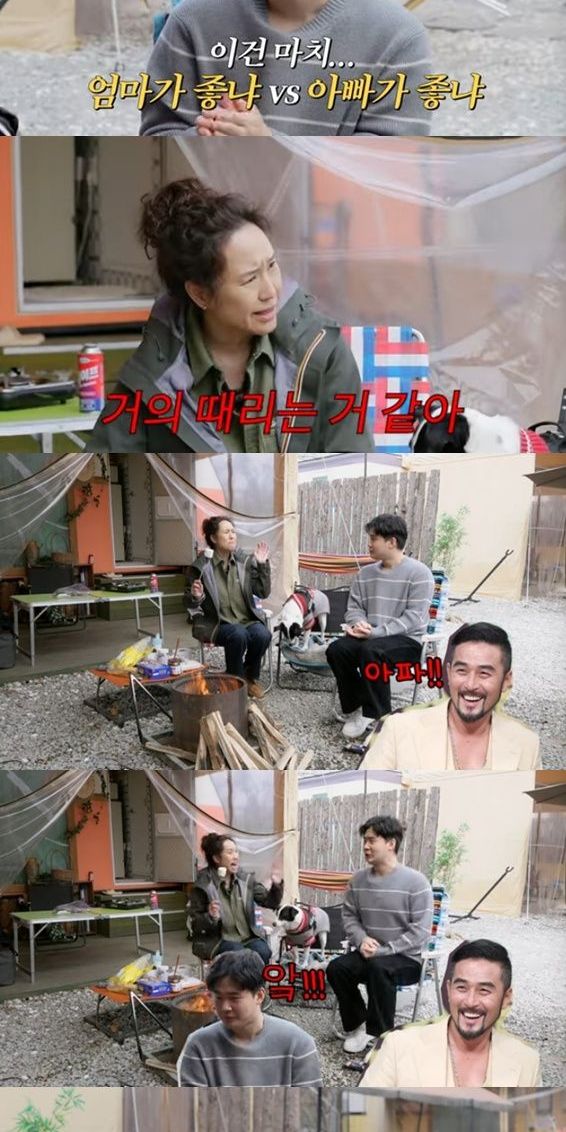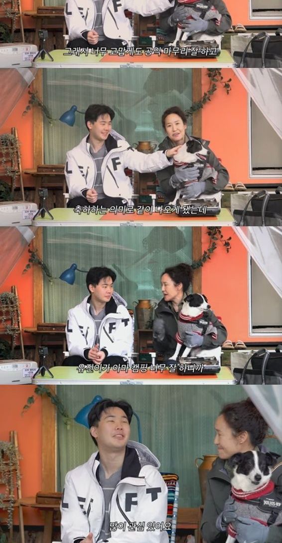 강주은은 "(아들이) 2주 전에 전역했다. 너무 고맙게도 공익 마무리를 잘하고 축하하는 의미로 같이 나오게 됐다. 잭도 같이 왔다. 유진이가 캠핑을 잘한다"라고 이야기했다.