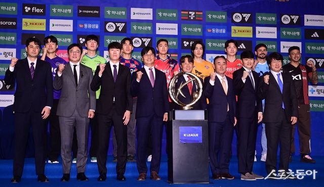 윗줄 왼쪽 끝에서 시계 방향으로 FC안양 이창용, 대전 하나 이창근, 수원FC 이용, 김천 상무 김민덕, 제주SK 김주공, 강원FC 김동현, 대구FC 세징야, FC서울 린가드, 대구FC 박창현 감독, 강원FC 정경호 감독, 제주SK 김학범 감독, FC서울 김기동 감독, 김천 상무 정정용 감독, 수원FC 김은중 감독, 대전 하나 황선홍 감독, FC안양 유병훈 감독이 13일 서울 서대문구 홍은동 스위스그랜드호텔에서 열린 ‘K리그 1 2025 개막 미디어데이’에서 기념 촬영을 하고 있다. 주현희 기자 teth1147@donga.com
