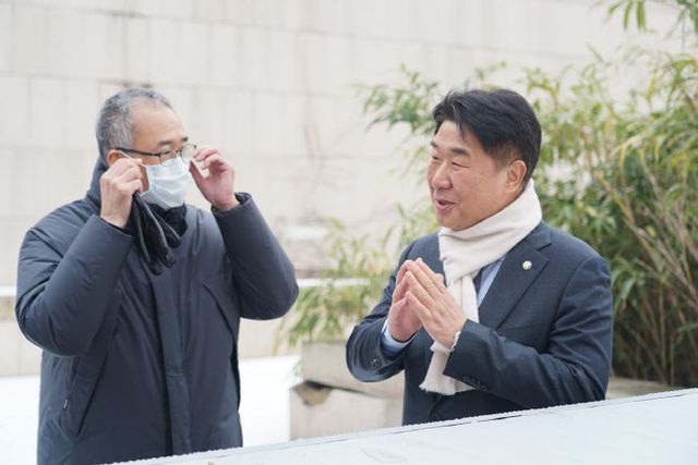 | 예술의전당 경내 자리했던 전두환 휘호석 철거 자리 살펴보고 있는 이기헌(오른쪽) 민주당 의원과 장형준 예술의전당 사장(사진=이기헌 의원실 제공). |