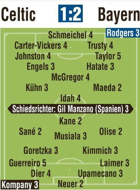 셀틱은 경기 내내 상대적인 약팀답지 않은 적극적인 공세를 펼쳤다. 경기 시작 30초 만에 니콜라스 쿤이 먼 거리에서 날린 왼발 슛이 골망을 흔들었으나, VAR 판독 끝에 오프사이드 판정이 내려졌다. 이후에도 셀틱은 여러 차례 위협적인 장면을 만들어냈지만, 바이에른의 골키퍼 마누엘 노이어의 선방과 수비진의 집중력에 막혔다.