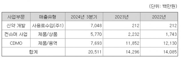 CDMO 사업은 매년 100억원 이상의 실적을 올리며 회사 매출의 대부분을 차지했다. 전체 매출(140억원)의 약 83%가 CDMO 사업에서 발생했다.