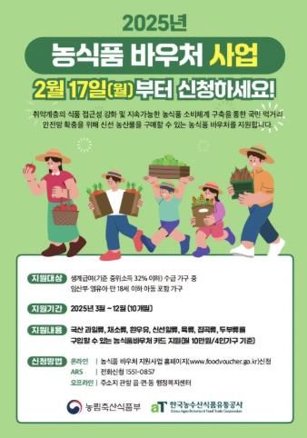 지원대상은 생계급여 수급 가구 중 임산부·영유아·만7세 부터만18세이하 아동 포함 가구로 주소지 읍·면사무소 방문, 온라인, 전화(농식품바우처 고객센터)를 통해 2월 17일부터 3월 21일까지 신청이 가능하다.