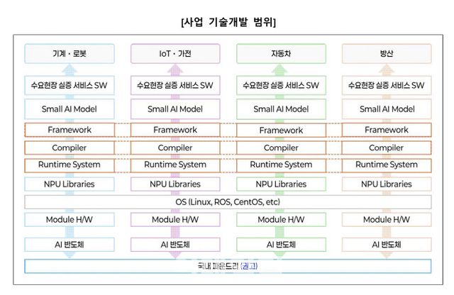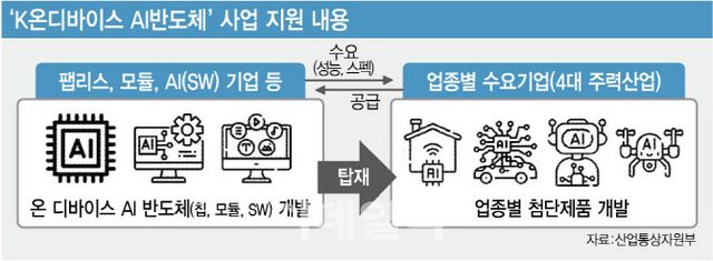 이는 기업들이 원하는 AI 반도체를 국내 토종 팹리스가 설계하고, 국내 파운드리(반도체 위탁생산)가 생산하는 형태다. 수요 기업과 팹리스, 파운드리를 연결해주는 사업이다. 업종별로 온디바이스 AI 칩을 개발해 4대 주력 사업의 첨단 제품을 만드는 것까지 목표로 한다.
