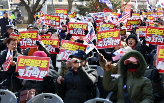 대한민국바로세우기국민운동본부 등 보수단체는 이날 안국역 5번 출구에서 탄핵 반대 집회를 개최했다. 집회 참가자들은 연신 ‘탄핵 무효’, ‘이재명 사형’ 등의 구호를 외쳤다. 이날 집회에선 유독 ‘부정선거’와 관련한 주장들이 쏟아졌다. 그간 헌재 재판관들을 향한 압박성 발언이 주를 이뤘지만, 이날은 부정선거에 초점이 맞춰졌다. 헌재가 문형배 헌재소장 직무대행을 향한 문자 테러와 관련해 강력한 경찰 수사를 요청한 것이 영향을 미친 것으로 풀이된다.