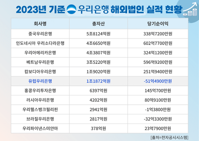 그런데 최근 글로벌 사업 중책을 맡으며 덩치를 키워나가는 모습과 달리 유럽우리은행의 내실은 주변의 기대에 한참 미치지 못하고 있다. 핵심 경영지표인 실적 부문에서 여전히 '적자기업' 꼬리표를 떼지 못하고 있는 실정이다. 2023년 기준 유럽우리은행은 51억4900만원의 당기순손실을 내며 우리은행 해외법인 가장 저조한 실적을 냈다. 우리은행 해외법인 중 50억 이상의 순손실을 낸 곳은 유럽우리은행이 유일하다. 같은 기간 유럽우리은행 자산의 3분에 1 수준인 러시아우리은행이 80억9100만원의 순이익을 기록한 것과 대비된다.