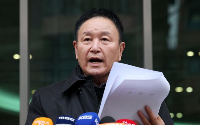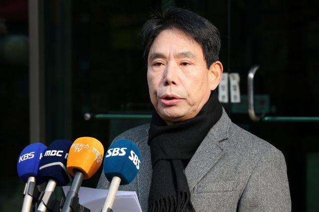 제55대 대한축구협회 선거에 출마하는 신문선 후보가 지난달 서울 종로구 축구회관 앞에서 긴급 기자회견을 하고 있다. / 뉴스1