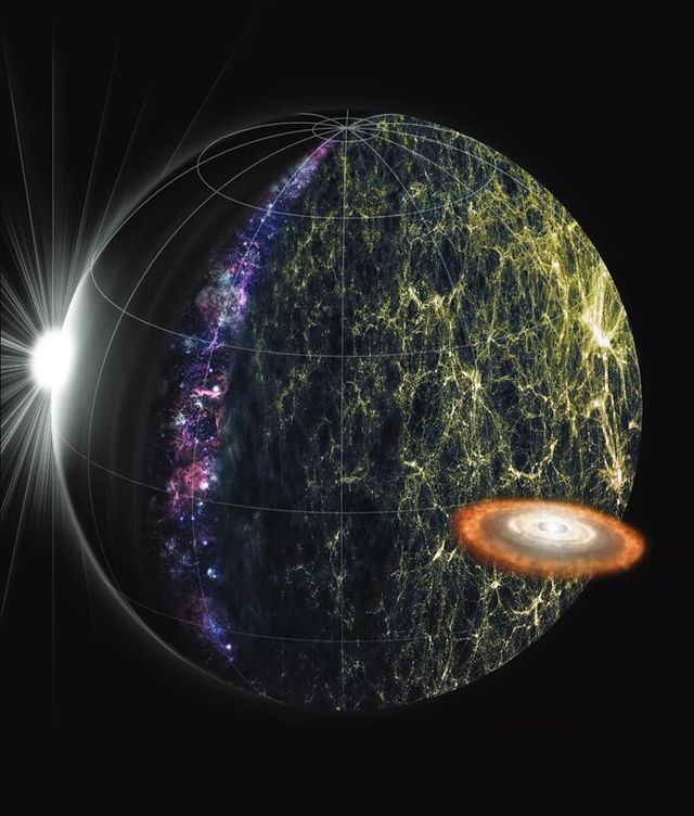 ▲ 스피어엑스는 발사 후 지구 표면에서 약 650km 고도로 떨어진 곳에서 2년 6개월 동안 우주 전체를 관측한다. 사진은 스피어엑스의 관측을 통해 얻어질 적외선 3차원 우주지도 및 관측 천체의 가상도. 우주항공청 이안 |