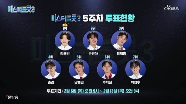 '미스터트롯3' 투표순위 5주차 결과에 이목이 쏠린다.