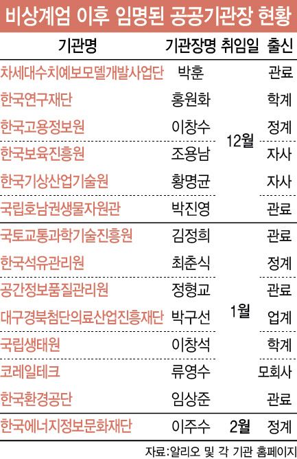 일각에선 정국 혼란에도 정치인 낙하산으로 의심되는 기관장 인사가 이뤄지는 데 대한 우려도 나온다. 실제 비상계엄 이후 임명된 14개 기관장 중 3명은 정계 출신이다. 정부 에너지 정책 홍보기관인 한국에너지정보문화재단은 이달 5일 이주수 전 서울시의회 의원을 임명했다. 앞서 최춘식 전 국회의원과 이창수 전 국민의힘 인권위원장도 각각 한국석유관리원과 한국고용정보원 원장으로 임명됐다.