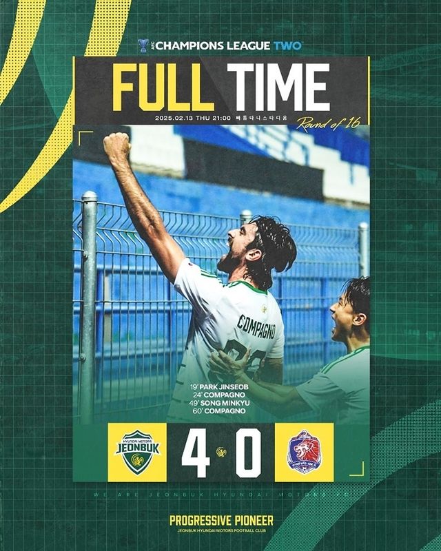 거스 포옛 감독이 이끄는 전북은 13일 태국 빠툼타니에 위치한 BG 스타디움에서 열린 포트FC(태국)와의 2024-25시즌 아시아축구연맹(AFC) 챔피언스리그2(ACL2) 16강 1차전에서 콤파뇨의 멀티골을 앞세워 4-0 대승을 거뒀다.