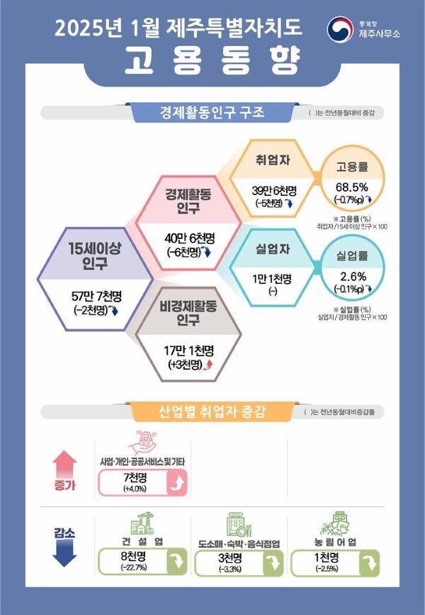 통계청 제주사무소가 14일 발표한 '2025년 1월 제주특별자치도 고용동향'에 따르면 15세 이상 인구는 57만7000명으로 전년동월대비 2000명(-0.3%) 감소한 가운데 경제활동인구는 40만6000명으로 전년동월대비 6000명(-1.3%), 경제활동참가율은 70.4%로 전년동월대비 0.7%p 하락했다.