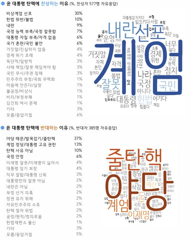 윤 대통령에 대한 탄핵 찬성 응답자는 주된 이유로 △비상계엄 선포(30%) △헌법 위반·불법(10%) △내란(9%) △국정 능력 부족·국정 잘못함(7%) △대통령 자질 부족·자격 없음, 국가 혼란·국민 불안(이상 6%) △거짓말·진실하지 않음, 경제 위기 초래(이상 4%) 등을 꼽았다.