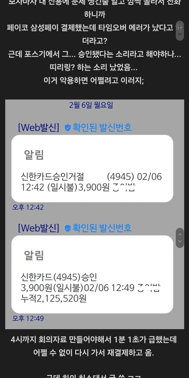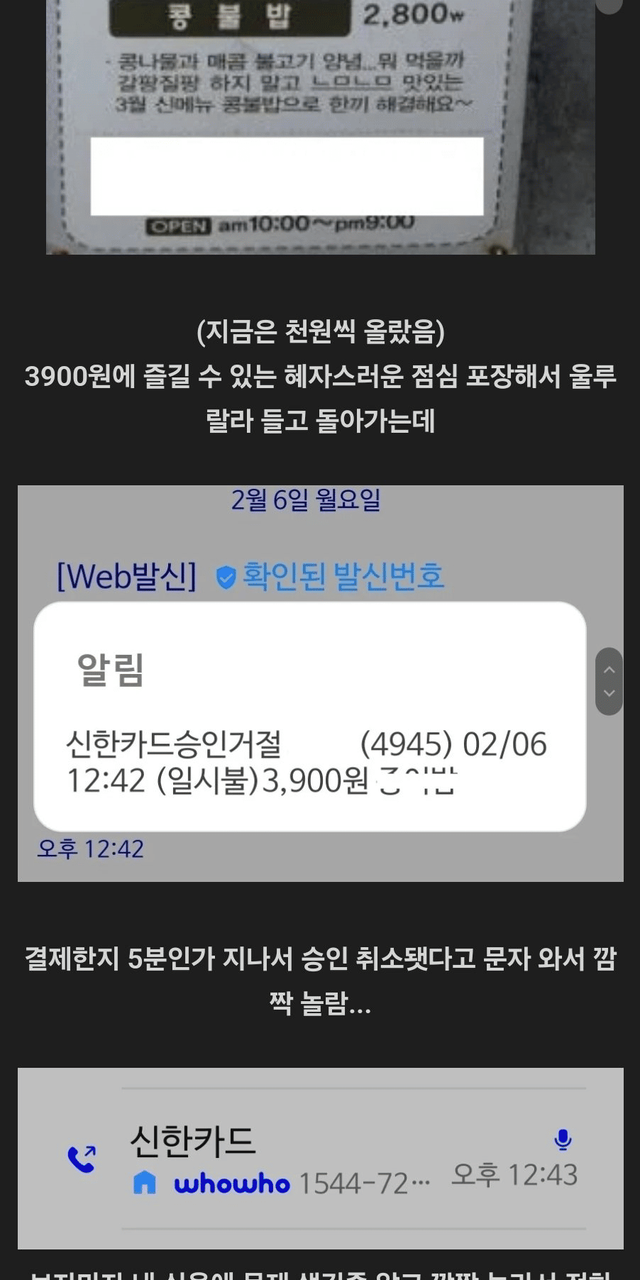 밥 포장해왔는데 카드 결제가 취소된 사람