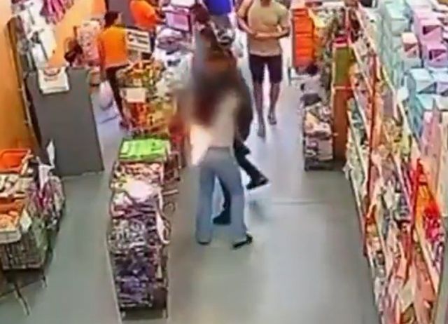 휴대전화에는 불이 붙었고 여성은 놀라 매장을 여기저기 뛰어다니다 CCTV 앵글을 벗어났다.