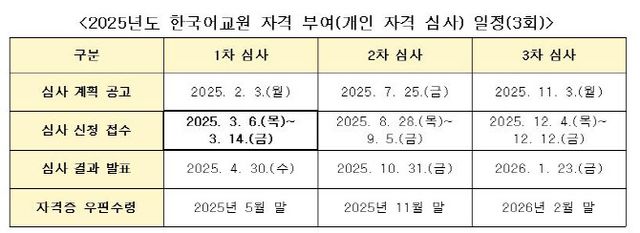 국립국어원은 예년과 같이 올해에도 3회에 걸쳐 한국어교원 개인 자격 심사를 진행한다. 아울러 한국어교원 자격 운영 정보시스템 개선을 통해 신청자가 한국어교원 자격증을 온라인으로 발급받을 수 있는 기능을 올 연말까지 개발할 예정이다.
