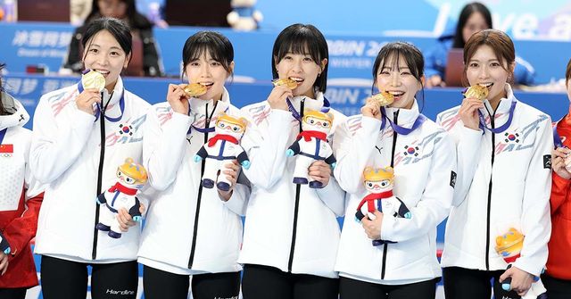 하얼빈 동계아시안게임 여자 컬링에서 금메달을 차지한 컬링 대표팀이 14일 중국 헤이룽장성 하얼빈시 핑팡컬링아레나에서 열린 시상식에서 메달을 깨물고 있다. / 뉴스1