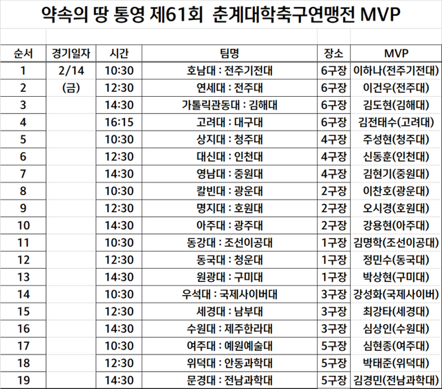 박한동 대학축구연맹 회장은 이번 대회 각 경기 최우수선수(MVP)를 선정하기로 했다. 다음은 박 회장이 뽑은 한산대첩기 예선 1일 차 MVP 명단이다.