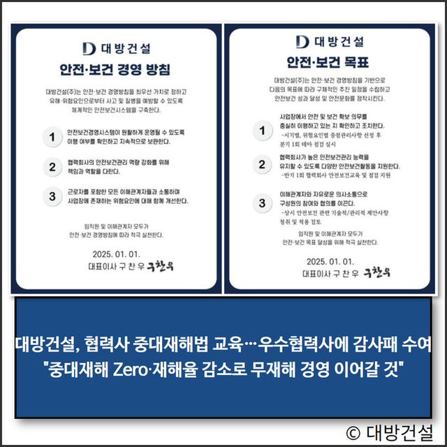 끝으로 대방건설은 2025년 전사 안전보건 목표를 4년 연속 중대산업재해 Zero로 설정하고 무재해 경영을 이어갈 것을 다짐했다.