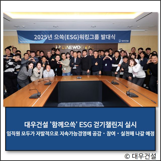 지난 2022년 ESG경영 선포 이래 대우건설은 내부역량을 강화함과 동시에 사회적 책임에도 충실이 대응해왔다. 2025년에도 환경‧사회‧지배구조 분야에서 ESG 경영의 괄목할 성과창출 및 지속경영이 가능한 기업으로 한 단계 더 발돋움하기 위해 으쓱(ESG)워킹그룹 발대식을 진행했다.