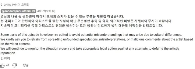 산다라박 유튜브 제작진은 "영상의 내용 중 문화권에 따라서 오해의 소지가 있을 수 있는 부분을 재편집했다"며 "본 에피소드와 관련하여 아티스트를 향한 사실이 아닌 무분별한 추측 및 억측, 악의적인 비방은 자제해달라"고 밝혔다.