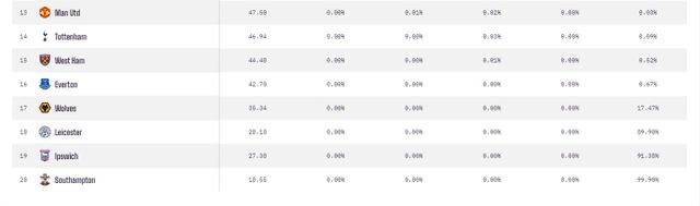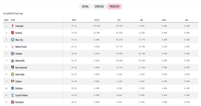 옵타가 예측한 프리미어리그 순위는 리버풀, 아스널, 맨시티, 노팅엄 포레트, 첼시, 뉴캐슬, 본머스, 애스턴 빌라, 풀럼, 브라이턴 앤드 호브 앨비언, 크리스털 팰리스, 브렌트퍼드, 맨체스터 유나이티드, 토트넘, 웨스트햄 유나이티드, 에버턴, 울버햄프턴 원더러스, 레스터 시티, 입스위치 타운, 사우스햄프턴으로 이어진다.
