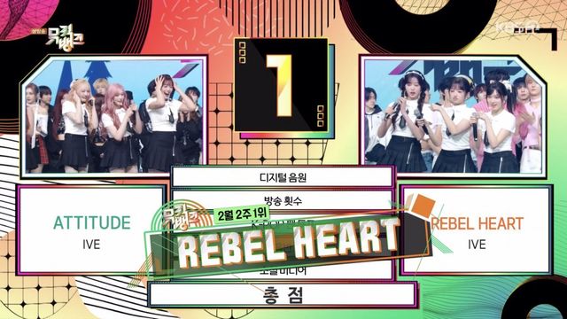 1위의 주인공은 ‘레블 하트’였다. 이로써 아이브는 ‘레블 하트’로만 무려 10번째 음악방송 트로피를 들어 올렸으며 ‘아이브 엠파시’ 앨범 통산 11관왕이 됐다.