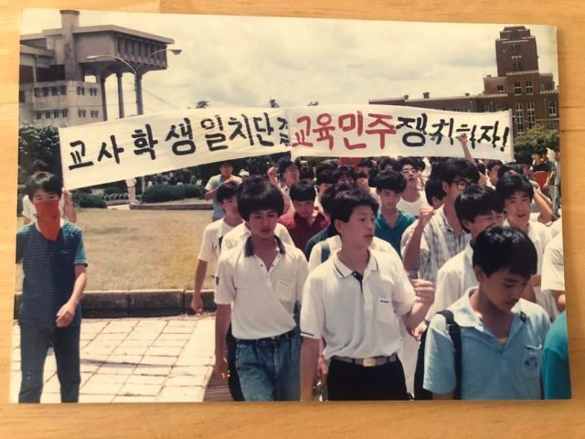 학민투는 구체적으로 학교별 사학재단 비리를 정리하려고 했는데, 학교 대부분이 사립이라 공감대는 쉬이 형성되었다. 당시 사립학교에 교사들이 임용 대가로 재단에 내는 기여금이 교사 1인당 2000만 원 정도였다는 걸 교사들 증언으로 확보했다. 내가 다니던 대동고에서 이 문제를 먼저 공론화했고 학생들과 함께 재단 사무실이 있는 시내를 향했다. 피켓을 들고 머리띠를 두르고선 재단 이사장 면담을 요청했지만 이사장은 나타나지 않았다. 그렇게 며칠을 재단 사무실에서 시위하자, 재단은 기여금을 내고 들어온 교사들에게(대동고 8명) 돈을 돌려주는 것으로 합의를 봤다. 첫 승리였다. 재단으로부터 돈을 돌려받은 교사들이 우리에게 고마움을 표했다.
