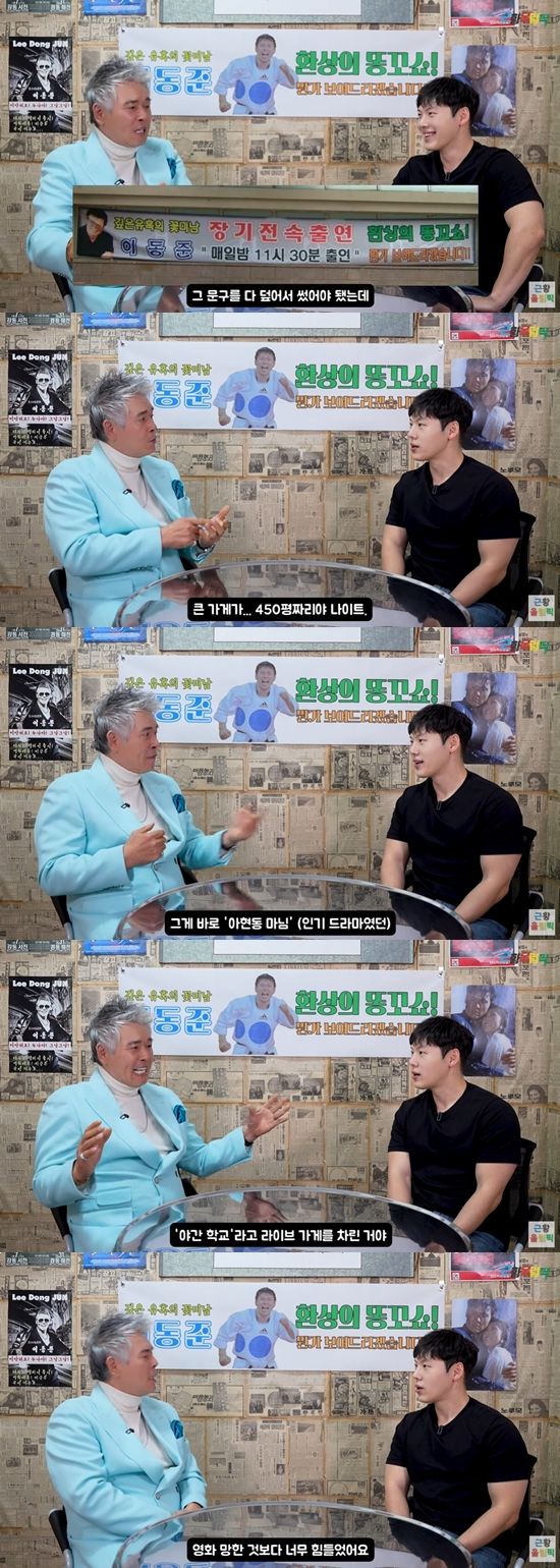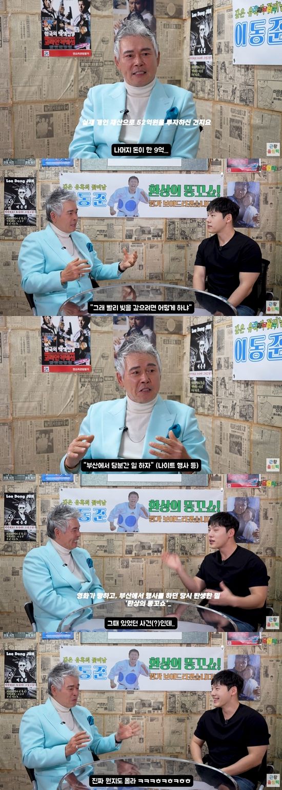 이동준은 "그렇게 서울에 올라와서 압구정동에 라이브 카페를 차렸다. 거기서 돈을 벌면서 크게 일을 벌렸다"며 "그 당시 25억짜리 땅을 사라고 옆에서 바람을 넣었다. 그래서 거기에 라이브 카페를 차리게 됐다. 당시 수중에 2억 5000만원 정도 밖에 없었다. 나머지 돈은 은행 빚으로 했다. 은행 빚을 갚는게 영화 망한 것 갚는 거 보다 힘들었다. 근데 그걸 내 걸로 만들었다. 현재 땅값으로 따지면 그게 한 180억 정도 된다"고 밝혀 놀라움을 안겼다.