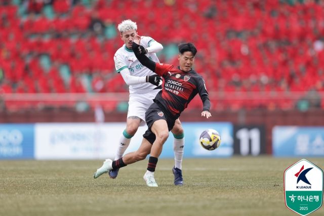 포항은 측면 공격으로 활로를 찾으려 했지만, 결실을 맺지 못했다. 전반 41분 이태석의 오른발 크로스가 안재준의 머리를 맞고 뒤로 흘렀다. 주닝요가 박스 안에서 넘어지며 왼발 슈팅으로 연결했으나, 공은 골대 위로 향했다. 바로 2분 뒤엔 역습 상황에서 완델손의 정확한 패스가 이호재에게 향했다. 수비 뒷공간을 뚫은 이호재는 오른발 슈팅으로 연결했으나, 이번에도 공은 골문을 외면했다. 추가시간 주닝요의 왼발 슈팅도 결과는 같았다.