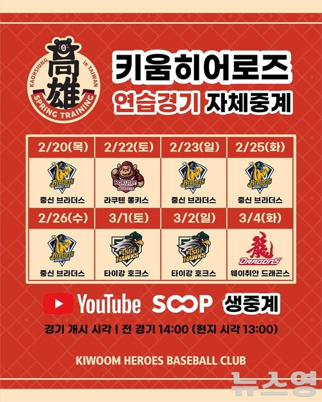 자체중계는 유튜브 키움히어로즈 공식 채널(youtube.com/heroesbaseballclub)과 라이브 플랫폼 ‘SOOP’에서 시청할 수 있다. 3월 1일(토), 2일(일) 타이강과의 경기는 SOOP에서만 볼 수 있다.