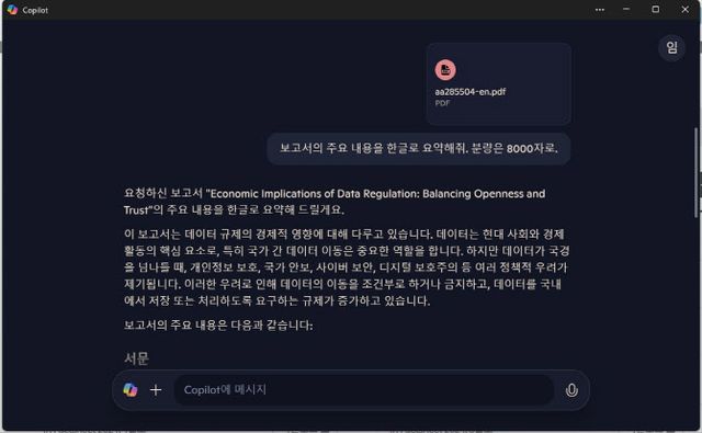 코파일럿은 키보드에 탑재된 ‘코파일럿 키’를 누르면 코파일럿이 즉시 실행된다. 코파일럿에 경제협력개발기구가 발행한 ‘데이터 규제의 경제적 영향’에 대한 영문 보고서를 PDF로 업로드한 뒤 주요 내용을 8000자 분량으로 요약해 달라고 요청하자 서문, 본문 결론으로 나눠 일목요연하게 정리해줬다. 오픈AI의 최신모델 GPT-4o를 기반로 답변하는 만큼, 성능은 만족스러웠다. 무료 버전 사용자는 한달에 질문이 50개로 제한된다.