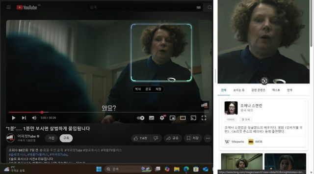웹서핑을 하거나 동영상을 보다가 인물, 상품, 장소 정보 등이 궁금할 때 작업표시줄에 고정해 놓은 AI 셀렉트 아이콘을 누르고 화면에 동그라미만 그리면 쉽게 정보를 찾을 수 있었다. 영화 소개 유튜브를 보다가 처음 보는 배우의 이름이 궁금해 AI 셀렉트를 누르고 얼굴에 동그라미를 그리니 ‘조애나 스캔런’ 이라는 빙 검색 결과가 떴다. 셀렉트 AI로 QR코드를 인식하고 링크를 바로 열 수 있다는 점도 편리했다. 행사 포스터 등에 참가 신청 링크가 QR 코드로 박혀 있는 경우 그동안 휴대폰을 꺼내 스캔해 링크에 접속해서 번거로웠는데, AI 셀렉트로 QR 링크 접속이 간편해졌다.
