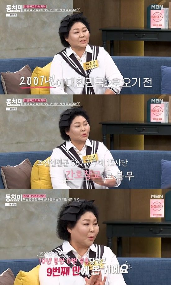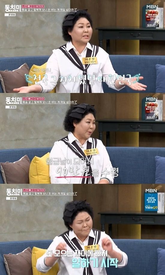 이순실은 "한국에 오니 하루 세 끼 밥 먹는 것만으로도 만족스럽더라"며 "돈이 없어서 공사장에 가서 보도블럭을 나르는 일을 했었다. 힘들어도 버텨서 한 달에 90만 원을 벌었었다. 북한에서는 9원도 벌기 힘들었는데"라고 얘기했다.