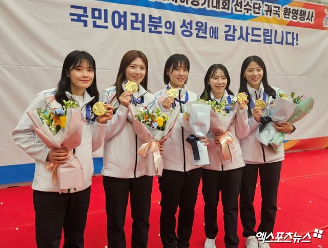 스킵 김은지, 서드 김민지, 세컨드 김수지, 리드 설예은, 핍스 설예지로 구성된 여자 컬링 대표팀 경기도청은 15일 열린 2025 하얼빈 동계아시안게임 대한민국 선수단 귀국 환영 행사에 참석했다.