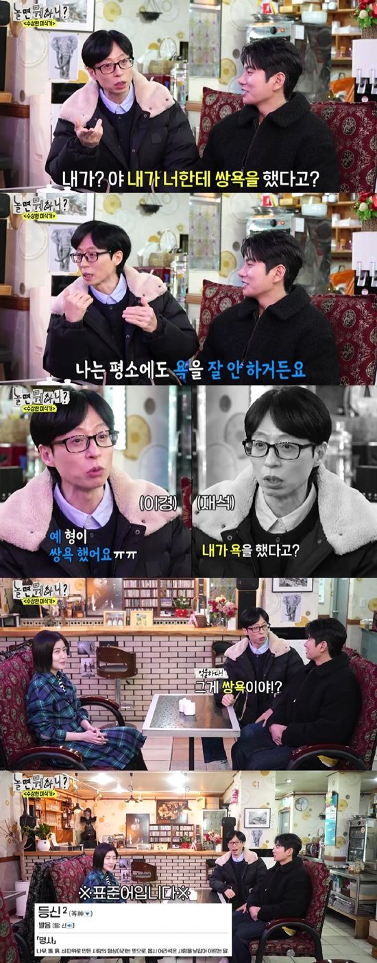 이날 이이경과 함께 거리를 걸으며 심은경이 있는 장소로 향하던 유재석은 "내가 언제 너한테 쌍욕을 했냐"고 발끈했고, 이이경은 "했다. 방송이라 말을 못 한다"고 반박했다.