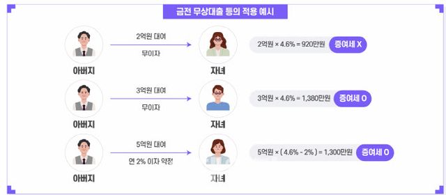 하지만 3억원을 빌리면 얘기가 달라진다. 3억원에 적정 이자율 4.6%를 곱하면 1380만원으로 1000만원을 넘게 돼 증여세 대상이다.