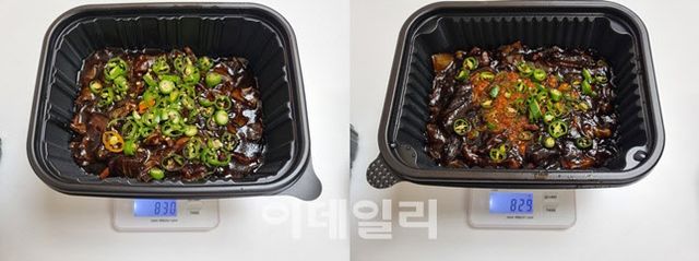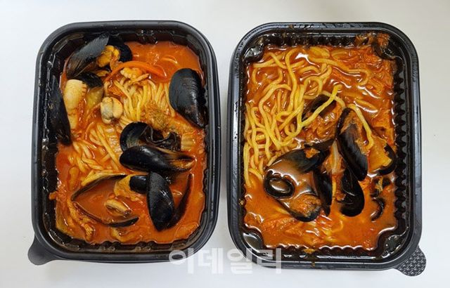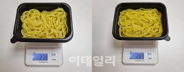 일단 포장부터 차이가 났다. A지점에서는 짬뽕 제품에 뜨거움과 홍합 껍질의 날카로움을 알리는 주의 문구 스티커가 붙어 있었고 단무지가 개별 플라스틱 포장에 담겨서 왔다. 반면 B지점에서는 주의 스티커가 없었고 단무지도 납품받은 포장 상품이 그대로 왔다. 무게에서도 다소 차이는 있었다. A지점 짬뽕 면은 238g에 불과했지만 B지점은 289g으로 50g 이상 차이가 났다.