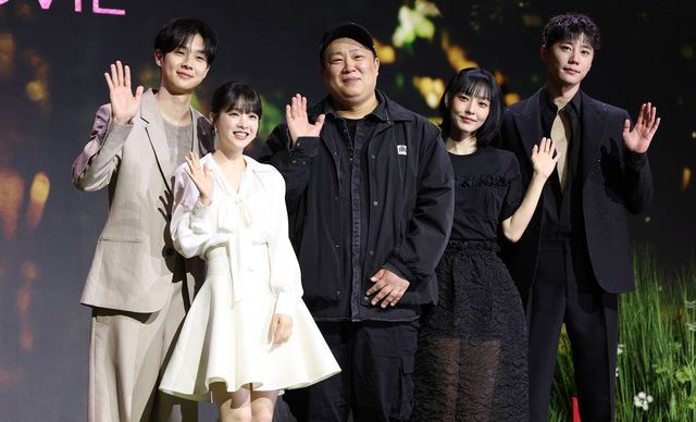 배우 최우식(왼쪽부터)과 박보영, 오충환 감독, 전소니, 이준영이 지난 12일 서울 종로구 JW메리어트 동대문 스퀘어 서울에서 열린 넷플릭스 시리즈 '멜로무비' 제작발표회에서 포즈를 취하고 있다. '멜로무비'는 사랑도 하고 싶고 꿈도 이루고 싶은 애매한 청춘들이 서로를 발견하고 영감이 되어주며 각자의 트라우마를 이겨내는 영화 같은 사랑을 그린 로맨스극이다 / 뉴스1