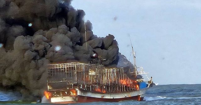 지난 13일 오전 8시 39분께 전북 부안군 왕등도 인근 해상에서 조업 중이던 어선에 불이 나 검은 연기가 치솟고 있다 / 연합뉴스(부안해경 제공)